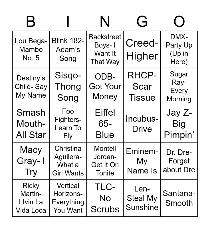 This bingo card has 27 words: Eminem- My Name Is, Santana- Smooth, RHCP- Scar Tissue, TLC- No Scrubs, Destiny’s Child- Say My Name, Backstreet Boys- I Want It That Way, Blink 182- Adam’s Song, Macy Gray- I Try, Incubus- Drive, Dr. Dre- Forget about Dre, Smash Mouth- All Star, Creed- Higher, Ricky Martin- LIvin La Vida Loca, Vertical Horizons- Everything You Want, Sugar Ray- Every Morning, Pearl Jam- Last Kiss, Sisqo- Thong Song, ODB- Got Your Money, Christina Aguilera- What a Girl Wants, Lou Bega- Mambo No. 5, Jay Z- Big Pimpin’, Len- Steal My Sunshine, Foo Fighters- Learn To Fly, Eiffel 65- Blue, Montell Jordan- Get It On Tonite, DMX- Party Up (Up in Here) and Dido- Thank You.