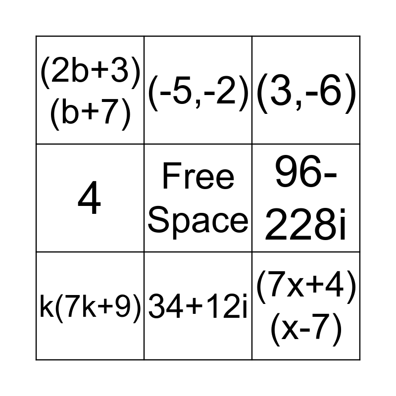 This bingo card has a free space and 8 words: 96-228i, (3,-6), (-5,-2), k(7k+9), (2b+3)(b+7), (7x+4)(x-7), 4 and 34+12i.