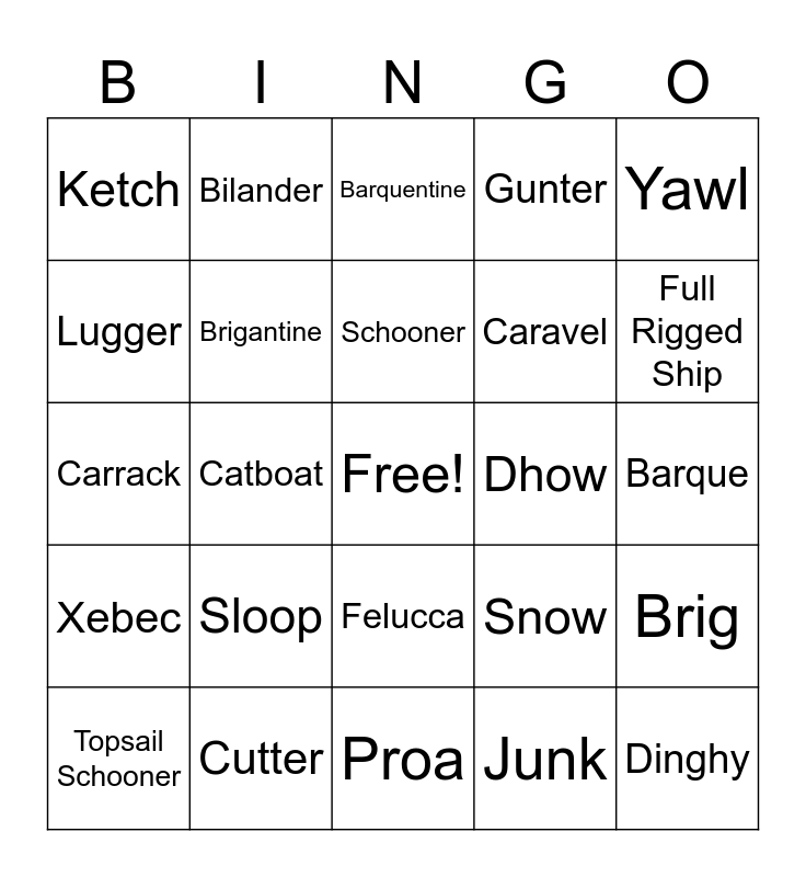 This bingo card has a free space and 24 words: Sloop, Cutter, Schooner, Topsail Schooner, Yawl, Ketch, Lugger, Bilander, Dhow, Felucca, Caravel, Carrack, Snow, Brig, Brigantine, Junk, Barque, Barquentine, Full Rigged Ship, Catboat, Dinghy, Xebec, Gunter and Proa.