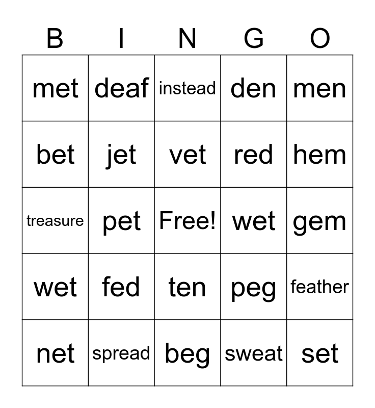 This bingo card has a free space and 39 words: pen, bed, hen, jet, net, ten, vet, web, men, wet, pet, den, set, gem, wet, fed, let, met, men, peg, bet, beg, red, hem, wed, get, leg, head, bread, deaf, wealthy, weather, instead, spread, sweat, health, feather, treasure and measure.