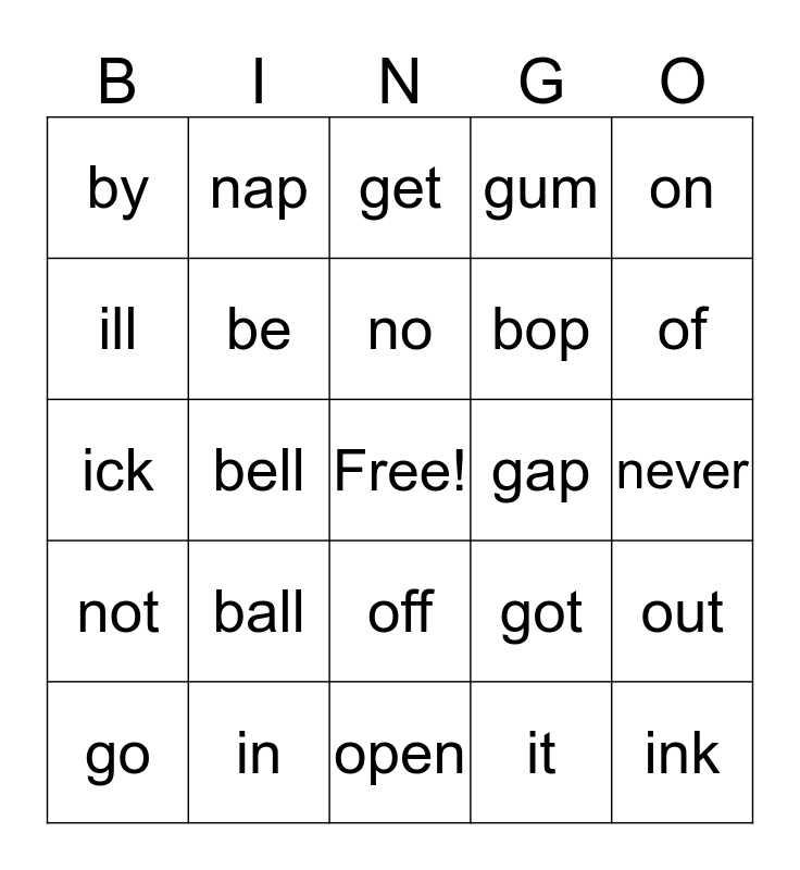 This bingo card has a free space and 24 words: ball, in, no, go, on, by, ill, nap, gap, off, bop, ick, got, out, be, it, never, get, of, bell, ink, not, gum and open.