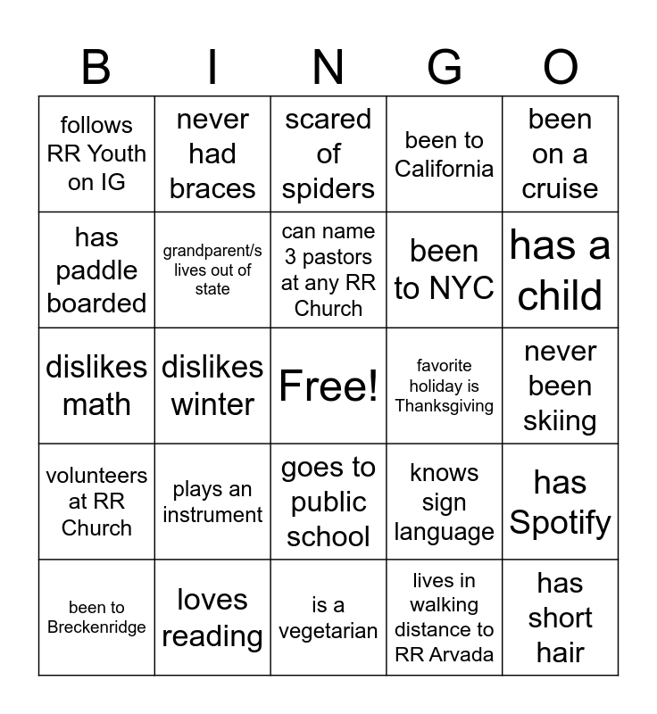 This bingo card has a free space and 29 words: been to Breckenridge, loves to snowboard, dislikes winter, loves sushi, follows RR Youth on IG, scared of spiders, grandparent/s lives out of state, plays an instrument, favorite holiday is Thanksgiving, loves reading, never been skiing, has short hair, is a vegetarian, lives in walking distance to RR Arvada, has a child, has a little sister, goes to public school, volunteers at RR Church, been on a cruise, dislikes math, knows sign language, has flown on a plane, been to NYC, has paddle boarded, been to California, never had braces, has Spotify, can name 3 pastors at any RR Church and dislikes sour candy.