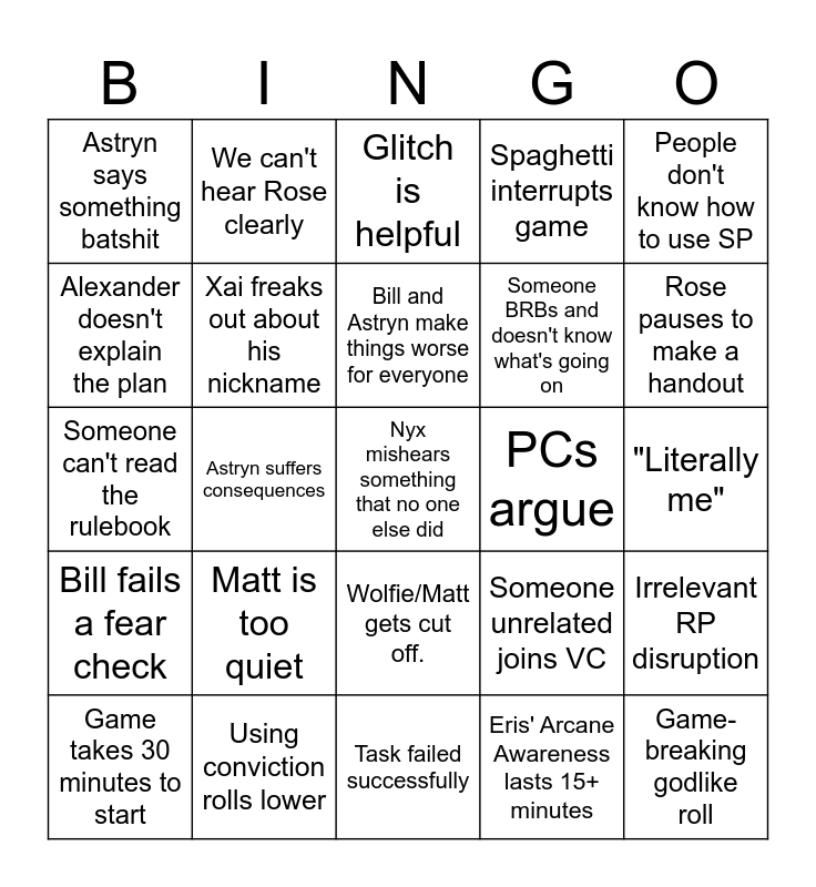 This bingo card has 25 words: Bill fails a fear check, Using conviction rolls lower, Nyx mishears something that no one else did, Eris' Arcane Awareness lasts 15+ minutes, People don't know how to use SP, Astryn says something batshit, We can't hear Rose clearly, Glitch is helpful, PCs argue, Irrelevant RP disruption, Alexander doesn't explain the plan, Xai freaks out about his nickname, Task failed successfully, Someone unrelated joins VC, Rose pauses to make a handout, Game takes 30 minutes to start, Astryn suffers consequences, Bill and Astryn make things worse for everyone, Someone BRBs and doesn't know what's going on, "Literally me", Someone can't read the rulebook, Matt is too quiet, Wolfie/Matt gets cut off., Spaghetti interrupts game and Game-breaking godlike roll.
