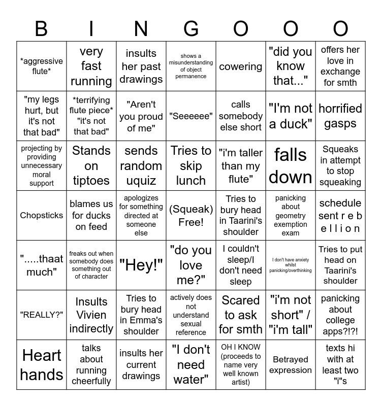 This bingo card has a free space and 48 words: Scared to ask for smth, "I'm not a duck", "I don't need water", blames us for ducks on feed, sends random uquiz, schedule sent r e b e l l i o n, very fast running, talks about running cheerfully, "did you know that...", "do you love me?", offers her love in exchange for smth, shows a misunderstanding of object permanence, falls down, "i'm taller than my flute", "REALLY?", panicking about geometry exemption exam, "my legs hurt, but it's not that bad", horrified gasps, "i'm not short" / "i'm tall", cowering, calls somebody else short, apologizes for something directed at someone else, *aggressive flute*, *terrifying flute piece* "it's not that bad", panicking about college apps?!?!, "Aren't you proud of me", Squeaks in attempt to stop squeaking, Heart hands, Tries to skip lunch, Stands on tiptoes, Betrayed expression, Tries to bury head in Taarini's shoulder, Tries to put head on Taarini's shoulder, Insults Vivien indirectly, Chopsticks, I couldn't sleep/I don't need sleep, I don't have anxiety whilst panicking/overthinking, projecting by providing unnecessary moral support, "Hey!", Tries to bury head in Emma's shoulder, ".....thaat much", texts hi with at least two "i"s, insults her past drawings, insults her current drawings, "Seeeeee", actively does not understand sexual reference, freaks out when somebody does something out of character and OH I KNOW (proceeds to name very well known artist).