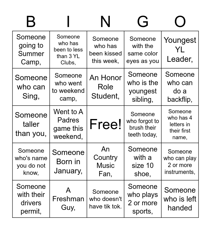This bingo card has a free space and 24 words: Someone Born in January,, A Freshman Guy,, An Honor Role Student,, Someone with their drivers permit,, Youngest YL Leader,, Someone going to Summer Camp,, Someone who can Sing,, Someone who has been to less than 3 YL Clubs,, Someone who forgot to brush their teeth today,, An Country Music Fan,, Someone who is the youngest sibling,, Someone taller than you,, Someone with a size 10 shoe,, Someone who can play 2 or more instruments,, Someone who went to weekend camp,, Someone who plays 2 or more sports,, Someone who has 4 letters in their first name,, Someone who has been kissed this week,, Someone who can do a backflip,, Went to A Padres game this weekend,, Someone who is left handed, Someone who's name you do not know,, Someone with the same color eyes as you and Someone who doesn't have tik tok..