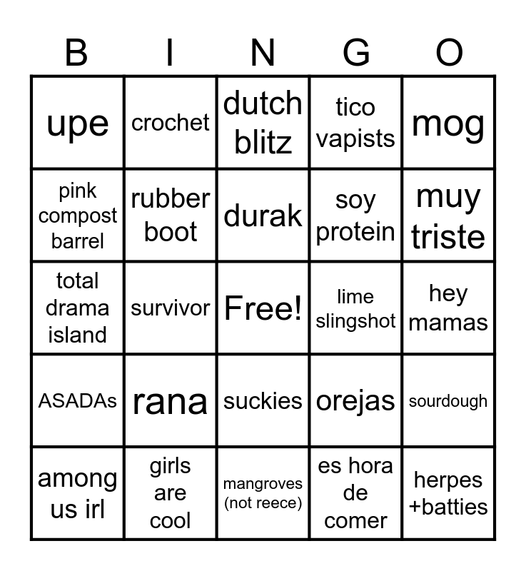 This bingo card has a free space and 24 words: rana, girls are cool, durak, among us irl, mog, upe, pink compost barrel, crochet, lime slingshot, suckies, soy protein, total drama island, orejas, sourdough, rubber boot, es hora de comer, hey mamas, dutch blitz, muy triste, survivor, herpes +batties, ASADAs, tico vapists and mangroves (not reece).