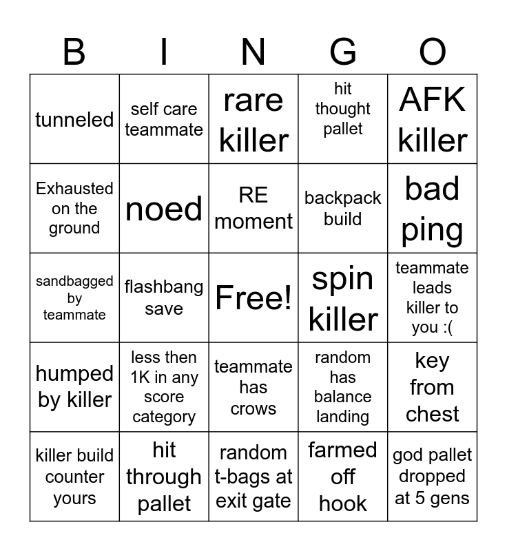 This bingo card has a free space and 76 words: random dc, die first hook, rare killer, killer finds you first, killer gives hatch, teammate down in 30 secs, facecamp killer, teammate dc on first down, 4 slowdown perks, teammate blows up gen, salty end game, baby surv, RE moment, Exhausted on the ground, 10 M from window, flashbang save, teammate throws for archive challenge, god pallet dropped at 5 gens, shirtless / swimsuit teammate, AFK killer, basement camped, sandbagged by teammate, noed, self care teammate, hit thought pallet, Killer use Iridescent perk, bad killer ping, dead on first hook, hex / boon surv name, Teammate hides in a locker instead of helping, Killer use Iridescent addon, God pallet used before 2 gens pop, random has self care, random has balance landing, bad ping, backpack build, random horrible flashy save, random actually flashlight saves you, teammate leads killer to you :(, farmed off hook, 4K at 5 gens, slugged for the 4 k, teammate suicides first hook, mr. ttv man, baby killer, hex destroyed first min, killer build counter yours, tunneled, farming / friendly killer, teammate doesnt recover on ground, you wiggle out, teammate has crows, long chase with no gen completed, killer closes hatch in your face, random uses for the people on you, p 100, inappropriate name, weird hit box, escaped, dying after gates open, less then 1K in any score category, 40K bp, all teachable build, morid without being hooked, surv going down in basement, 3 gen, spin killer, killer wiff, any indoor map, getting sniped, key from chest, humped by killer, hit through pallet, killer has franklin / lightborn, random t-bags at exit gate and random leaves us to die.