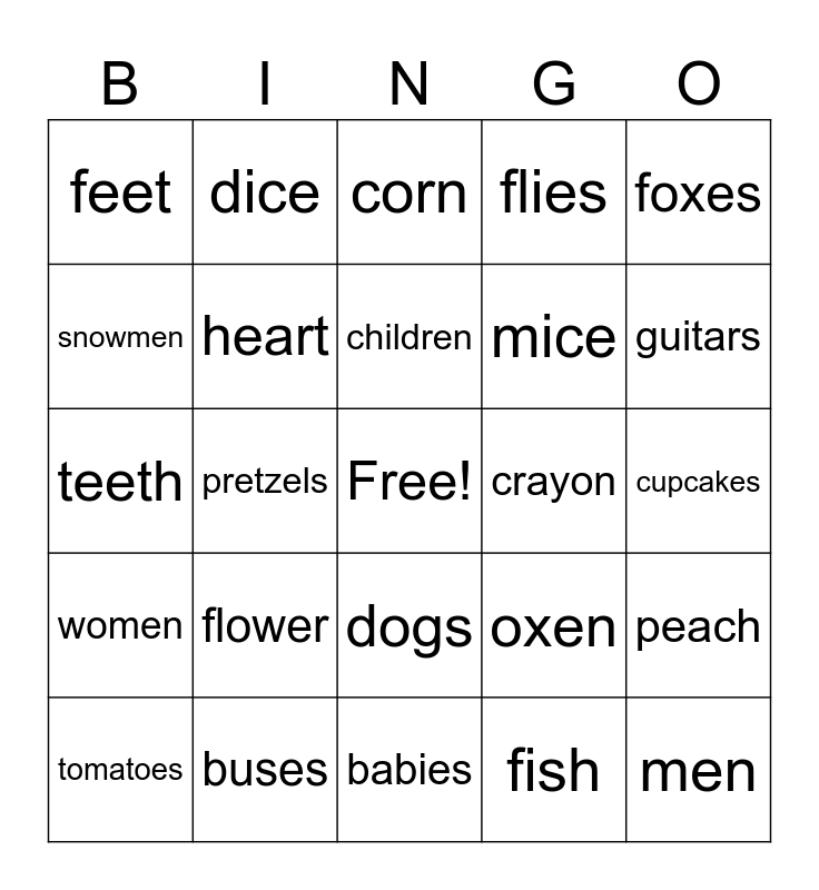 This bingo card has a free space and 25 words: tomatoes, flower, children, fish, guitars, feet, dice, corn, mice, peach, teeth, heart, oxen, men, snowmen, buses, babies, flies, cupcakes, women, pretzels, dogs, crayon, foxes and scissors.
