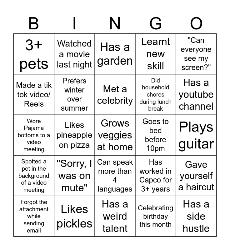 This bingo card has a free space and 30 words: Likes pickles, 🍉, Likes pineapple on pizza, Made sushi at home, 3+ pets, Has a garden, Prefers winter over summer, Can speak more than 4 languages, Goes to bed before 10pm, Has a weird talent, Plays guitar, Has a side hustle, Celebrating birthday this month, Woke up before 6am today, Has a youtube channel, Prefers tea over coffee, Has worked in Capco for 3+ years, Spotted a pet in the background of a video meeting, "Sorry, I was on mute", "Can everyone see my screen?", Wore Pajama bottoms to a video meeting, 25, Watched a movie last night, Did household chores during lunch break, Made a tik tok video/ Reels, Learnt new skill, Gave yourself a haircut, Forgot the attachment while sending email, Met a celebrity and Has a work from home song playlist.