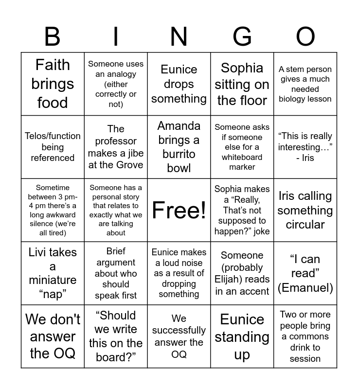 This bingo card has a free space and 24 words: Brief argument about who should speak first, “Should we write this on the board?”, Amanda brings a burrito bowl, We don't answer the OQ, A stem person gives a much needed biology lesson, Faith brings food, Telos/function being referenced, Someone uses an analogy (either correctly or not), Sophia makes a “Really, That’s not supposed to happen?” joke, Eunice makes a loud noise as a result of dropping something, Someone asks if someone else for a whiteboard marker, Sometime between 3 pm-4 pm there’s a long awkward silence (we’re all tired), Someone (probably Elijah) reads in an accent, “I can read” (Emanuel), The professor makes a jibe at the Grove, Eunice standing up, Iris calling something circular, Eunice drops something, “This is really interesting…” - Iris, Someone has a personal story that relates to exactly what we are talking about, Two or more people bring a commons drink to session, Livi takes a miniature “nap”, Sophia sitting on the floor and We successfully answer the OQ.