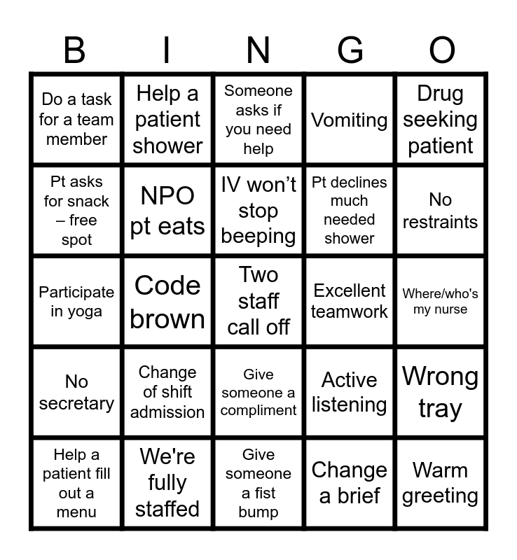 This bingo card has 38 words: Free!, Naked pt in hallway, Pt who does not shower, showers, NPO pt eats, Wrong tray, Change of shift admission, IV won’t stop beeping, Pt asks to speak to management, Drug seeking patient, Pt declines much needed shower, Code brown, Vomiting, Two staff call off, Where/who's my nurse, Pt asks for snack – free spot, No secretary, Someone tells you “I appreciate you”, Someone asks if you need help, Someone thanks you for your help, Excellent teamwork, Do a task for a team member, We're fully staffed, No restraints, Help a patient fill out a menu, Patient asks for a hug, Give someone a fist bump, Warm greeting, Hold the door for someone, Give pt a journal, Encourage patient to attend groups, Encourage pt to get out of bed, Give someone a compliment, Change a brief, Help a patient shower, Deescalate a patient, Active listening, Participate in yoga and Patient asks for meds/gum.