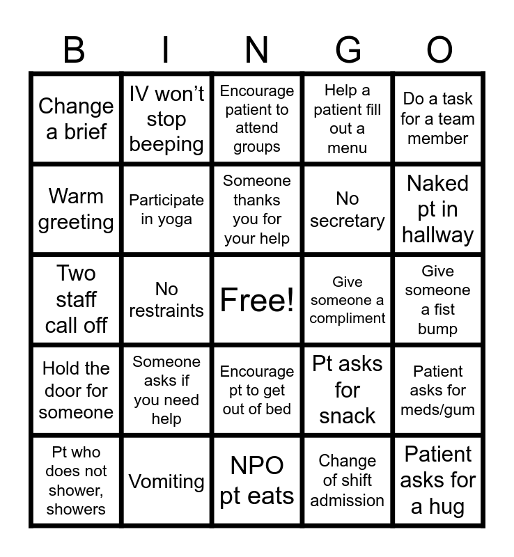 This bingo card has a free space and 37 words: Help a patient shower, Deescalate a patient, Active listening, Participate in yoga, Patient asks for meds/gum, Someone asks if you need help, Someone thanks you for your help, Excellent teamwork, Do a task for a team member, We're fully staffed, No restraints, Help a patient fill out a menu, Patient asks for a hug, Give someone a fist bump, Warm greeting, Hold the door for someone, Give pt a journal, Encourage patient to attend groups, Encourage pt to get out of bed, Give someone a compliment, Change a brief, Naked pt in hallway, Pt who does not shower, showers, NPO pt eats, Wrong tray, Change of shift admission, IV won’t stop beeping, Pt asks to speak to management, Drug seeking patient, Pt declines much needed shower, Code brown, Vomiting, Two staff call off, Where/who's my nurse, Pt asks for snack, No secretary and Someone tells you “I appreciate you”.