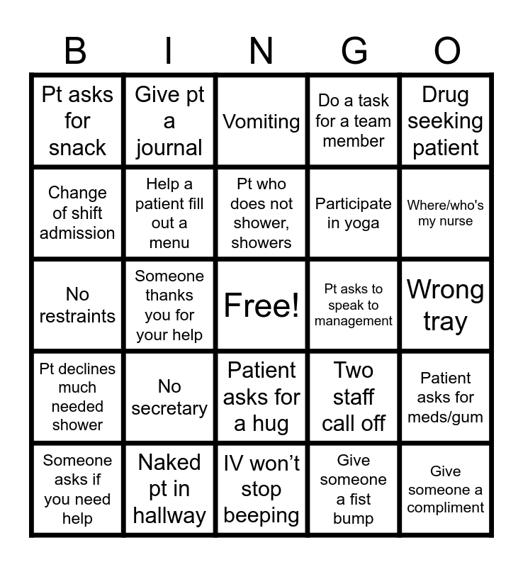 This bingo card has a free space and 37 words: Help a patient shower, Deescalate a patient, Active listening, Participate in yoga, Patient asks for meds/gum, Someone asks if you need help, Someone thanks you for your help, Excellent teamwork, Do a task for a team member, We're fully staffed, No restraints, Help a patient fill out a menu, IV won’t stop beeping, Pt asks to speak to management, Drug seeking patient, Pt declines much needed shower, Code brown, Vomiting, Two staff call off, Where/who's my nurse, Pt asks for snack, No secretary, Patient asks for a hug, Give someone a fist bump, Warm greeting, Hold the door for someone, Give pt a journal, Encourage patient to attend groups, Encourage pt to get out of bed, Give someone a compliment, Change a brief, Naked pt in hallway, Pt who does not shower, showers, NPO pt eats, Wrong tray, Change of shift admission and Someone tells you “I appreciate you”.