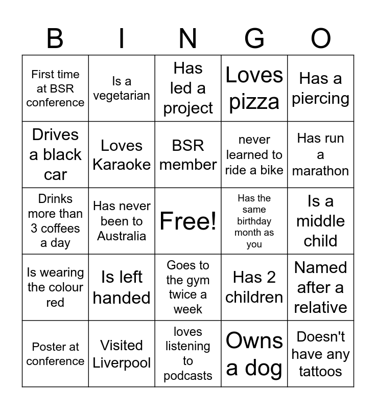 This bingo card has a free space and 24 words: Is left handed, Visited Liverpool, BSR member, Poster at conference, Has a piercing, First time at BSR conference, Drives a black car, Is a vegetarian, Has the same birthday month as you, Goes to the gym twice a week, never learned to ride a bike, Drinks more than 3 coffees a day, Has 2 children, Named after a relative, Loves Karaoke, Owns a dog, Is a middle child, Has led a project, Has run a marathon, Has never been to Australia, Doesn't have any tattoos, Is wearing the colour red, Loves pizza and loves listening to podcasts.