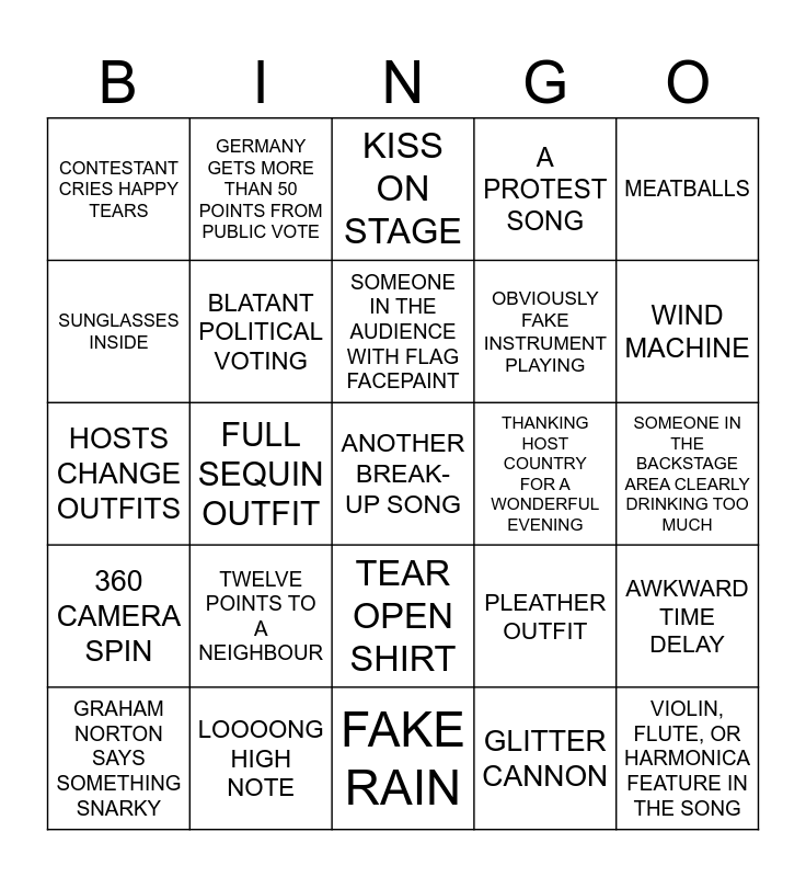This bingo card has 49 words: Free!, ANOTHER BREAK-UP SONG, THIS COUNTRY ISN'T IN EUROPE!, FAKE RAIN, TWELVE POINTS TO A NEIGHBOUR, WINKING AT THE CAMERA, GERMANY GETS MORE THAN 50 POINTS FROM PUBLIC VOTE, BOOING, SUNGLASSES INSIDE, MID-SONG COSTUME CHANGE, BLATANT POLITICAL VOTING, A PROTEST SONG, AWKWARD TIME DELAY, PLEATHER OUTFIT, PRESENTER STRUGGLING TO FILL TIME, THE U.K. GETS LESS THAN 10 POINTS, SOMEONE IN THE AUDIENCE WITH FLAG FACEPAINT, THANKING HOST COUNTRY FOR A WONDERFUL EVENING, SINGING OUT OF TUNE, MEATBALLS, FULL SEQUIN OUTFIT, GLITTER CANNON, CONTESTANT CRIES HAPPY TEARS, OBVIOUSLY FAKE INSTRUMENT PLAYING, WHISTLING, WIND MACHINE, GRAHAM NORTON SAYS SOMETHING SNARKY, MAN WITH EXTREMELY BLEACHED HAIR, TEAR OPEN SHIRT, 360 CAMERA SPIN, UNUSED STAGE PROPS, THANK YOU EUROPE!, ANIMALS IN ANY FORM, CRINGE PRESENTER JOKE, LOOOONG HIGH NOTE, HEAVY BREATHING INTO MIC, EXCESSIVE SMOKE, CASTLE DRONESHOT, SOMEONE IN THE BACKSTAGE AREA CLEARLY DRINKING TOO MUCH, BAREFOOT ARTIST, YOUR FAVOURITE SONG GETS 12 POINTS FROM A COUNTRY, VERY REVEALING DRESS, VIOLIN, FLUTE, OR HARMONICA FEATURE IN THE SONG, TECHNICAL ISSUES, HOSTS CHANGE OUTFITS, KISS ON STAGE, HOSTS JOKE ABOUT SSWEDEN’S SUCCESS, UNEXPECTED GENRE CHANGE and SONG SOUNDS FAMILIAR.