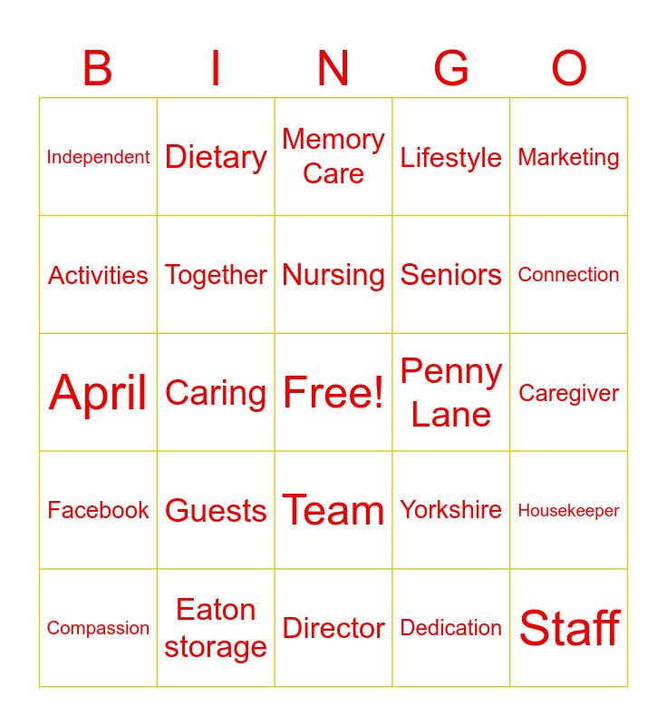 This bingo card has a free space and 29 words: Compassion, Community, Caring, Assisted, Independent, Memory Care, Together, Guests, Penny Lane, Eaton storage, Caregiver, Staff, Director, Dedication, Connection, Family, Team, Facebook, Marketing, April, Yorkshire, Celebration, Seniors, Activities, Lifestyle, Dietary, Housekeeper, Nursing and Wellness.