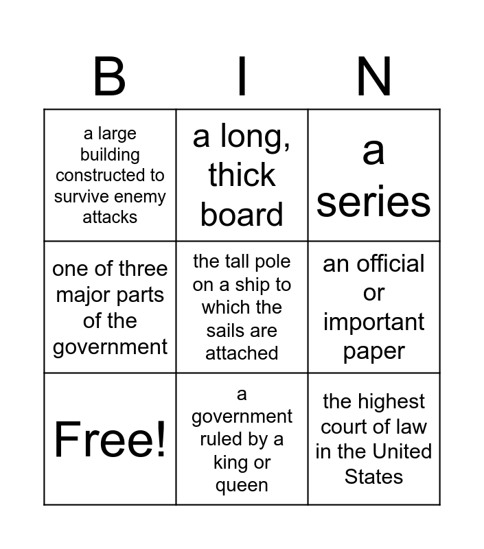 This bingo card has 9 words: Free!, a series, a long, thick board, one of three major parts of the government, a large building constructed to survive enemy attacks, an official or important paper, the tall pole on a ship to which the sails are attached, the highest court of law in the United States and a government ruled by a king or queen.