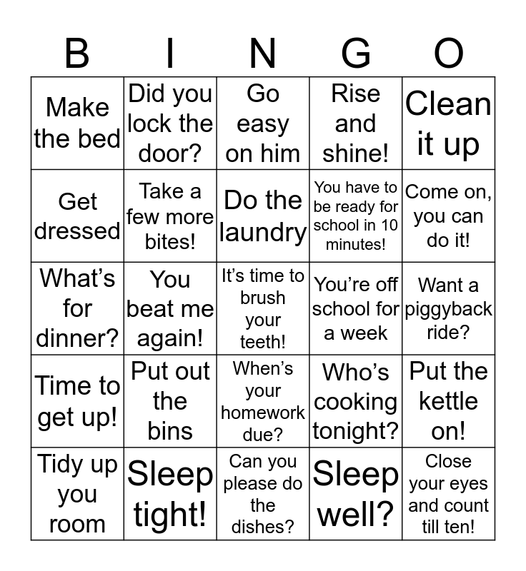 This bingo card has 25 words: Put out the bins, Can you please do the dishes?, Do the laundry, Tidy up you room, Clean it up, Make the bed, Get dressed, Did you lock the door?, You’re off school for a week, When’s your homework due?, You have to be ready for school in 10 minutes!, What’s for dinner?, Who’s cooking tonight?, Put the kettle on!, Take a few more bites!, Close your eyes and count till ten!, Want a piggyback ride?, Go easy on him, Come on, you can do it!, You beat me again!, It’s time to brush your teeth!, Sleep tight!, Time to get up!, Rise and shine! and Sleep well?.