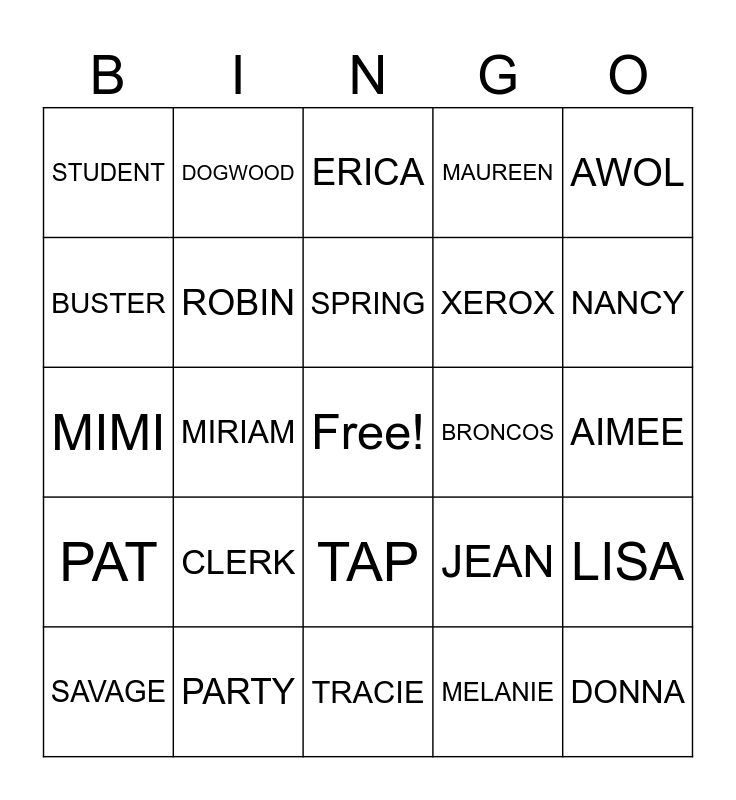 This bingo card has a free space and 24 words: CLERK, PARTY, SPRING, SAVAGE, AWOL, STUDENT, BUSTER, DOGWOOD, BRONCOS, TAP, XEROX, MIMI, JEAN, LISA, ROBIN, MELANIE, AIMEE, ERICA, NANCY, MIRIAM, DONNA, PAT, MAUREEN and TRACIE.