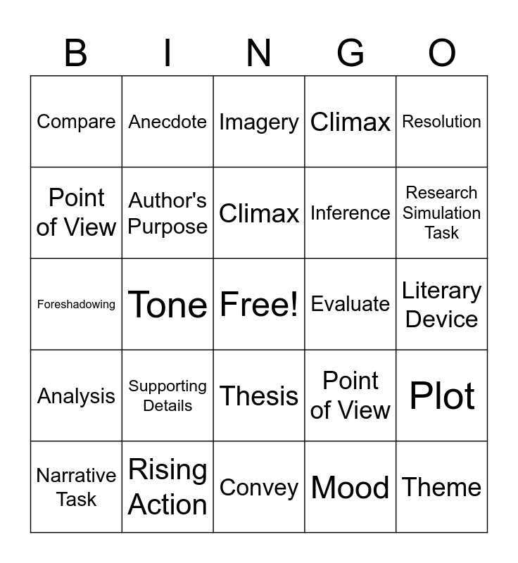 This bingo card has a free space and 49 words: Genre, Theme, Central Idea, Convey, Supporting Details, Summary, Anecdote, Plot, Point of View, Exposition, Author's Purpose, Climax, Plot, Point of View, Exposition, Author's Purpose, Climax, Evaluate, Contrast, Resolution, Tone, Mood, Compare, Inference, Textual Evidence, Research Simulation Task, Narrative Task, Literary Analysis Task, Thesis, Analysis, Narrative, Poem, Introduce Cite Explain, Title Author Genre, Rising Action, Falling Action, Introduction, Conclusion, Literary Device, Simile, Metaphor, Allusion, Inner Thinking, Dialogue, Foreshadowing, Imagery, Personification, Onomatopoeia and Flashback.