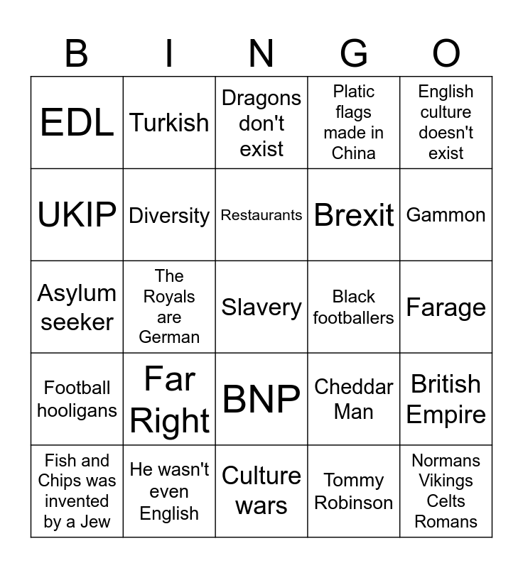 This bingo card has 25 words: Far Right, Culture wars, Restaurants, Fish and Chips was invented by a Jew, English culture doesn't exist, EDL, UKIP, Turkish, Black footballers, BNP, Brexit, Asylum seeker, Cheddar Man, British Empire, Diversity, Normans Vikings Celts Romans, Farage, Dragons don't exist, Gammon, The Royals are German, Slavery, He wasn't even English, Football hooligans, Platic flags made in China and Tommy Robinson.