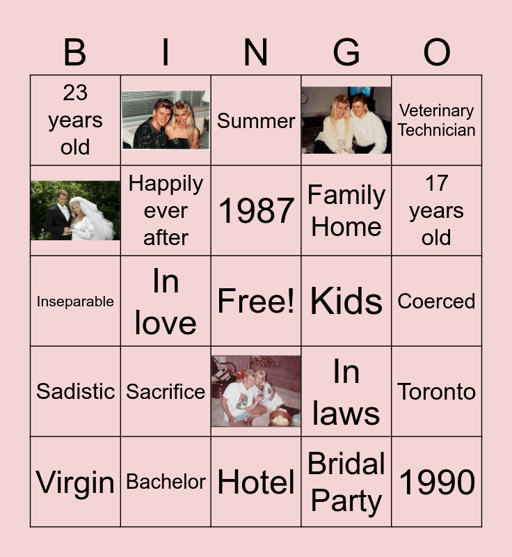 This bingo card has 5 images, a free space and 24 words: Restaurant, Bachelor, Summer, Wedding, Veterinary Technician, 23 years old, Happily ever after, 1987, Kids, Toronto, Virgin, In love, Bridal Party, 1990, Inseparable, Honeymoon, Hotel, In laws, 17 years old, Sadistic, Sacrifice, criminal mastermind, Family Home and Coerced.