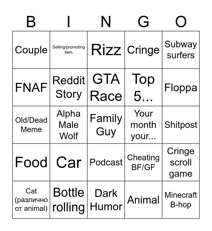 This bingo card has a free space and 24 words: Car, Bottle rolling, GTA Race, Cat (различно от animal), Subway surfers, Couple, FNAF, Selling/promoting item, Your month your..., Podcast, Top 5..., Old/Dead Meme, Cheating BF/GF, Cringe scroll game, Reddit Story, Animal, Shitpost, Rizz, Floppa, Alpha Male Wolf, Minecraft B-hop, Food, Cringe and Dark Humor.