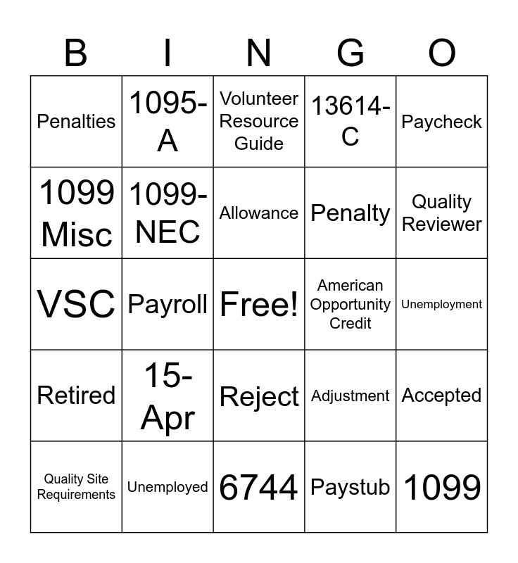 This bingo card has a free space and 46 words: 1040, 1099, 4012, 6744, 15-Apr, 1040-X, 1095-A, 1098-T, 1099 Misc, 1099-MISC, 1099-NEC, 13614-C, Accepted, Adjustment, Advance Child Tax Credit, Advanced, Allowance, American Opportunity Credit, Amount Owed, Paycheck, Payroll, Paystub, Penalties, Penalty, Publication, Quality Reviewer, Quality Site Requirements, Refund, Reject, Retired, Rollover, Schedule A, Schedule C, Self-Prep, TSC, Unemployed, Unemployment, United Way, UWSCC, VITA, Volunteer, Volunteer Resource Guide, VSC, W-2, W-4 and W-7.