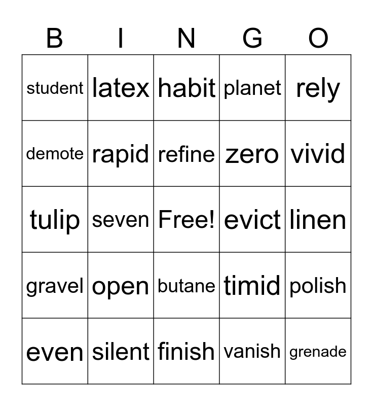 This bingo card has a free space and 24 words: open, silent, refine, even, rely, student, demote, latex, evict, butane, zero, tulip, timid, polish, rapid, vanish, linen, habit, vivid, seven, grenade, gravel, planet and finish.