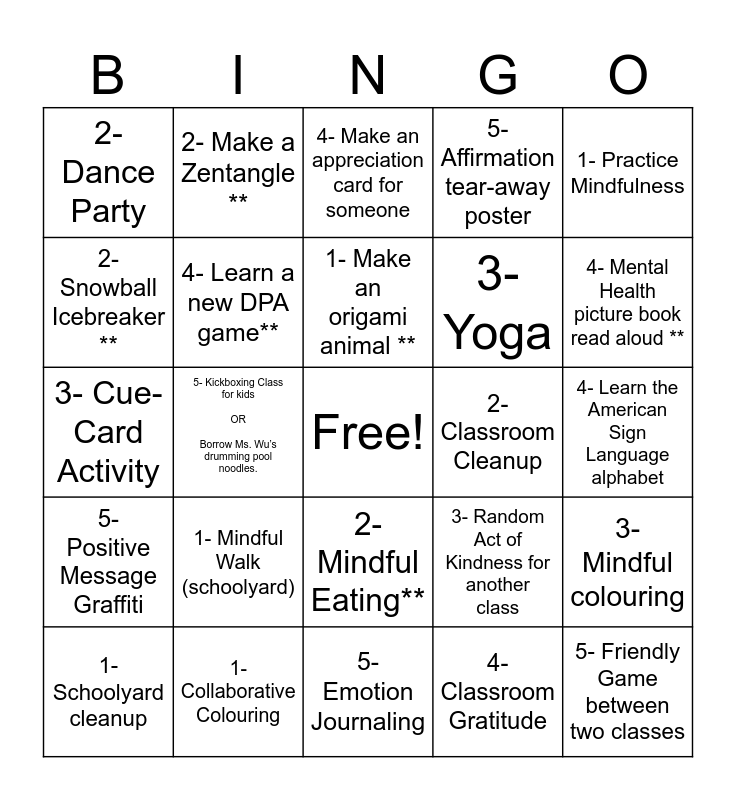 This bingo card has a free space and 24 words: 1- Mindful Walk (schoolyard), 1- Collaborative Colouring, 1- Make an origami animal **, 1- Schoolyard cleanup, 1- Practice Mindfulness, 2- Dance Party, 2- Snowball Icebreaker **, 2- Make a Zentangle **, 2- Classroom Cleanup, 2- Mindful Eating**, 3- Yoga, 3- Cue-Card Activity, 3- Random Act of Kindness for another class, 3- Mindful colouring, 4- Learn a new DPA game**, 4- Classroom Gratitude, 4- Learn the American Sign Language alphabet, 4- Make an appreciation card for someone, 4- Mental Health picture book read aloud **, 5- Kickboxing Class for kids OR Borrow Ms. Wu’s drumming pool noodles., 5- Friendly Game between two classes, 5- Positive Message Graffiti, 5- Affirmation tear-away poster and 5- Emotion Journaling.