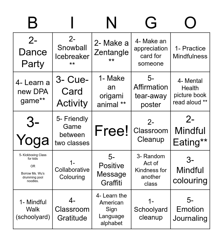 This bingo card has a free space and 24 words: 1- Mindful Walk (schoolyard), 1- Collaborative Colouring, 1- Make an origami animal **, 1- Schoolyard cleanup, 1- Practice Mindfulness, 2- Dance Party, 2- Snowball Icebreaker **, 2- Make a Zentangle **, 2- Classroom Cleanup, 2- Mindful Eating**, 3- Yoga, 3- Cue-Card Activity, 3- Random Act of Kindness for another class, 3- Mindful colouring, 4- Learn a new DPA game**, 4- Classroom Gratitude, 4- Learn the American Sign Language alphabet, 4- Make an appreciation card for someone, 4- Mental Health picture book read aloud **, 5- Kickboxing Class for kids OR Borrow Ms. Wu’s drumming pool noodles., 5- Friendly Game between two classes, 5- Positive Message Graffiti, 5- Affirmation tear-away poster and 5- Emotion Journaling.