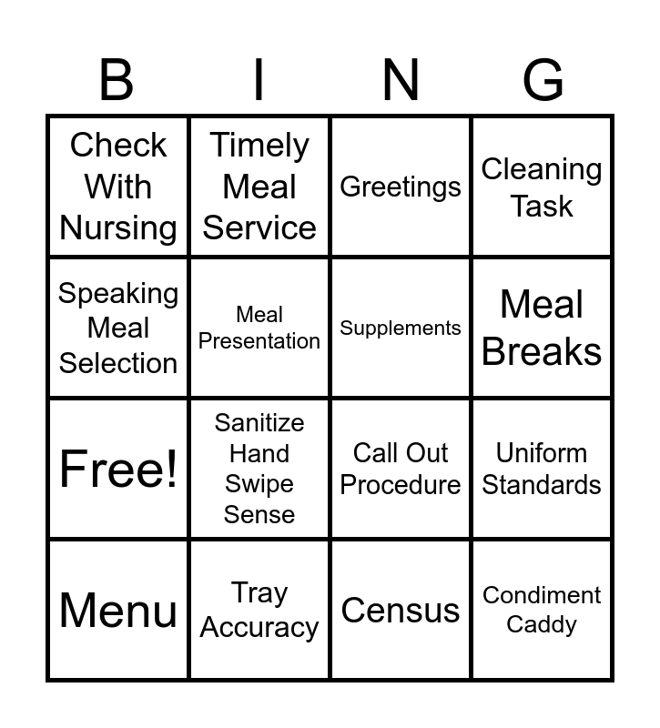 This bingo card has 20 words: Uniform Standards, Pleasant Entrance, Greetings, Pleasant Exit, Menu, Speaking Meal Selection, Tray Accuracy, Check With Nursing, Free!, Timely Meal Service, Sanitize Hand Swipe Sense, Call Out Procedure, Meal Presentation, Condiment Caddy, Supplements, Attendance, Meal Breaks, Cleaning Task, Census and Two Identifiers.