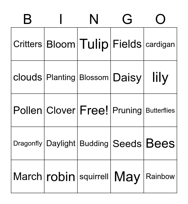 This bingo card has a free space and 64 words: allergies, April, April Showers, Bees, Bike ride, Birds, Bloom, Bloom, Blossom, Blue sky, Budding, Bunnies, Butterflies, cardigan, chipmunk, clouds, Clover, Critters, Daffodil, Daisy, Daylight, Dragonfly, Fields, Flower, Fresh Air, frog, Garden, goose, Grass, iris, Ivy, ladybug, Laundry Day, leaf, lily, March, Marigold, May, May Flowers, Planting, Pollen, Pruning, quack, Rain, Rain Boots, Rainbow, robin, Roses, Seeds, Spring Break, Spring Cleaning, Sprout, squirrell, Sunshine, taxes, Thunderstorms, Tulip, umbrella, Warmth, Wheelbarrow, Willow, Wisteria, worm and Zinnias.