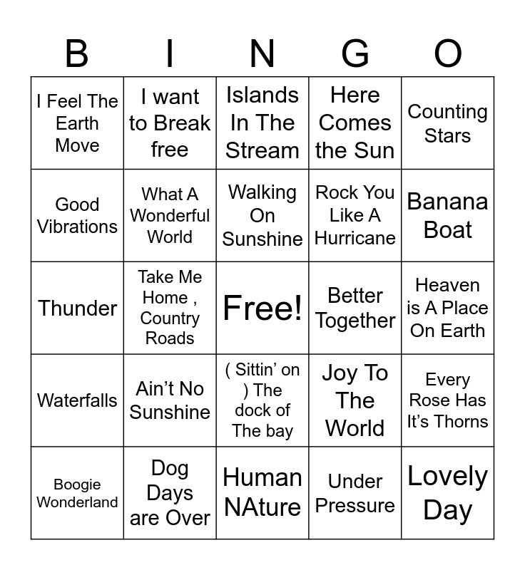 This bingo card has a free space and 56 words: Lets Groove, Boogie Wonderland, September, I Feel The Earth Move, Human NAture, Waiting On The World To Change, What A Wonderful World, Over The Rainbow, Rock You Like A Hurricane, Brighter Than The Sun, Here Comes the Sun, Don’t Worry Be Happy, Ain’t No Mountain High Enough, Welcome To The Jungle, Circle Of Life, Waka Waka, Counting Stars, Take Me Home , Country Roads, I Can See Clearly Now, Lovely Day, Better Together, Good Day Sunshine, Joy To The World, Islands In The Stream, My Tennessee Mountain Home, Walking On Sunshine, ( What A ) Wonderful World, Fly Me To The Moon, Banana Boat, Don’t Go Near The Water, Three Little Birds, Mercy Mercy me, This Land Is Your Land, Send Me On My Way, Heaven is A Place On Earth, Good Vibrations, Thunder, On My Way, Waterfalls, I want to Break free, ( Sittin’ on ) The dock of The bay, Purple Rain, Weatherman, Beautiful Things, Bubbly, Ain’t No Sunshine, Dog Days are Over, I’m Like A Bird, Baby , I Love Your Way, What About Us, Under Pressure, Thunderstruck, Planet Rock, Shining Star, Every Rose Has It’s Thorns and Sunflower.