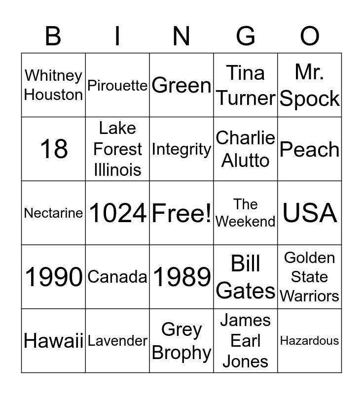This bingo card has a free space and 24 words: Canada, Lavender, Integrity, Hawaii, Mr. Spock, Whitney Houston, 18, Pirouette, The Weekend, 1989, Charlie Alutto, Nectarine, Bill Gates, Golden State Warriors, Lake Forest Illinois, James Earl Jones, USA, Green, Peach, 1024, Hazardous, 1990, Tina Turner and Grey Brophy.