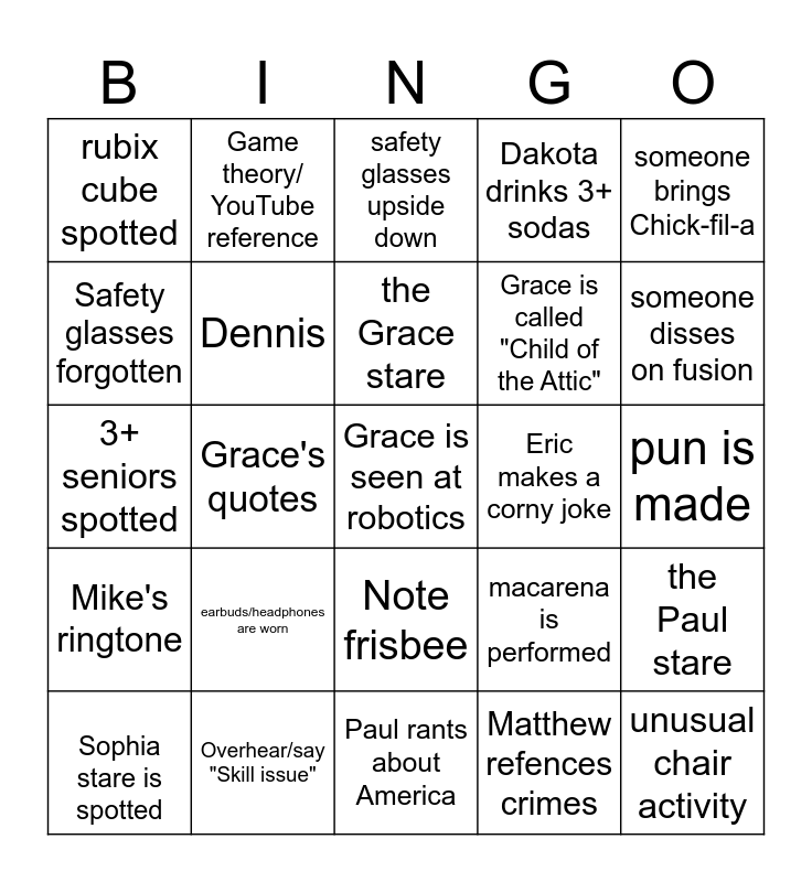 This bingo card has a free space and 29 words: Sophia stare is spotted, programmers try to hide, Grace's quotes, Craig whistles, rubix cube spotted, safety glasses upside down, Dennis, earbuds/headphones are worn, Eric makes a corny joke, Overhear/say "Skill issue", pun is made, unusual chair activity, Paul rants about America, Matthew refences crimes, someone disses on fusion, spin the Gatorade bottle, Note frisbee, Mike's ringtone, someone brings Chick-fil-a, 3+ seniors spotted, macarena is performed, Will makes bet, Grace is called "Child of the Attic", Safety glasses forgotten, Dakota drinks 3+ sodas, Game theory/ YouTube reference, the Paul stare, the Grace stare and Taivan says something ridiculous with a straight face.