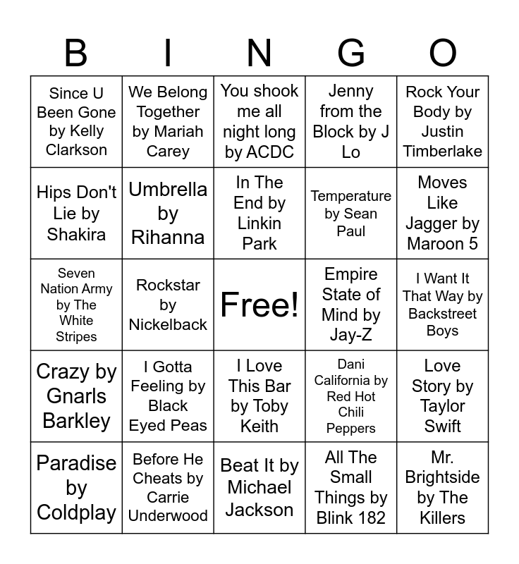 This bingo card has a free space and 53 words: Don't Stop Believin' by Journey, Mr. Brightside by The Killers, Man! I feel like a Woman! By Shania Twain, All The Small Things by Blink 182, I Gotta Feeling by Black Eyed Peas, Drops of Jupiter by Train, We Belong Together by Mariah Carey, Live Like You Were Dying by Tim McGraw, Hips Don't Lie by Shakira, Party in the USA by Miley Cyrus, Umbrella by Rihanna, Ms. Jackson by Outkast, Love Story by Taylor Swift, Dani California by Red Hot Chili Peppers, Boulevard of Broken Dreams by Green Day, Paradise by Coldplay, In The End by Linkin Park, Empire State of Mind by Jay-Z, It Wasn't Me by Shaggy, Rock Your Body by Justin Timberlake, Rockstar by Nickelback, Beautiful Girls by Sean Kingston, Temperature by Sean Paul, Since U Been Gone by Kelly Clarkson, Tennessee Whiskey by Chris Stapleton, Before He Cheats by Carrie Underwood, Love in this Club by Usher, No One by Alicia Keys, Firework by Katy Perry, Moves Like Jagger by Maroon 5, Poker Face by Lady Gaga, Single Ladies by Beyonce, A Thousand Miles by Vanessa Carlton, Bye Bye Bye by NSYNC, Lose Yourself by Eminem, Oops!…I Did It Again by Britney Spears, Jenny from the Block by J Lo, Beat It by Michael Jackson, You shook me all night long by ACDC, I Wanna Dance with Somebody by Whitney Houston, Wannabe by Spice Girls, Shake It Off by Taylor Swift, I Want It That Way by Backstreet Boys, ABC by The Jackson 5, Fast Car by Luke Combs, I Love This Bar by Toby Keith, Sweet Child O' Mine by Guns N' Roses, Hey Ya! by Outkast, Seven Nation Army by The White Stripes, Crazy by Gnarls Barkley, This is How We Do It by Montell Jordan, Happy - From "Despicable Me2" by Pharrell Williams and Temperature by Sean Paul.
