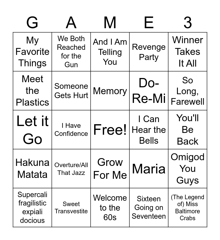 This bingo card has a free space and 50 words: Good Morning Baltimore, (The Legend of) Miss Baltimore Crabs, You Can't Stop the Beat, Welcome to the 60s, Overture/All That Jazz, Cell Block Tango, We Both Reached for the Gun, Take Me or Leave Me, Meet the Plastics, Apex Predator, Someone Gets Hurt, Revenge Party, Omigod You Guys, Maria, America, I Dreamed a Dream, Memory, I Can Hear the Bells, Bend and Snap, Winner Takes It All, I Have Confidence, Sixteen Going on Seventeen, My Favorite Things, Do-Re-Mi, The Sound of Music, The Lonely Goatherd, So Long, Farewell, Dreamgirls, And I Am Telling You, Grow For Me, Suddenly, Seymour, Science Fiction /Double Feature, Touch-a, Touch-a, Touch Me, Time Warp, Sweet Transvestite, Dammit Janet, Rose Tint My World, My Shot, The Schuyler Sisters, You'll Be Back, Alexander Hamilton, Helpless, Sister Suffragette, A Spoonful of Sugar, Supercali fragilistic expiali docious, Let it Go, Love is an Open Door, Do You Want to Build a Snowman, Hakuna Matata and Can You Feel the Love Tonight.