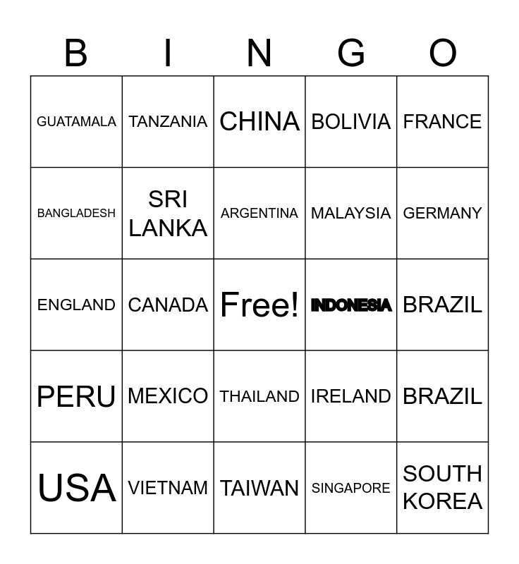 This bingo card has a free space and 29 words: USA, INDIA, CANADA, HONDOURAS, GUATAMALA, CHINA, SRI LANKA, MEXICO, INDONESIA, VIETNAM, BRAZIL, SOUTH KOREA, TAIWAN, SINGAPORE, GERMANY, ITALY, THAILAND, PERU, FRANCE, ENGLAND, IRELAND, CAMBODIA, MALAYSIA, BANGLADESH, BOLIVIA, TANZANIA, BRAZIL, ARGENTINA and JAPAN.