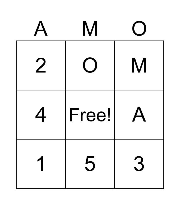 This bingo card has a free space and 8 words: A, M, O, 1, 2, 3, 4 and 5.
