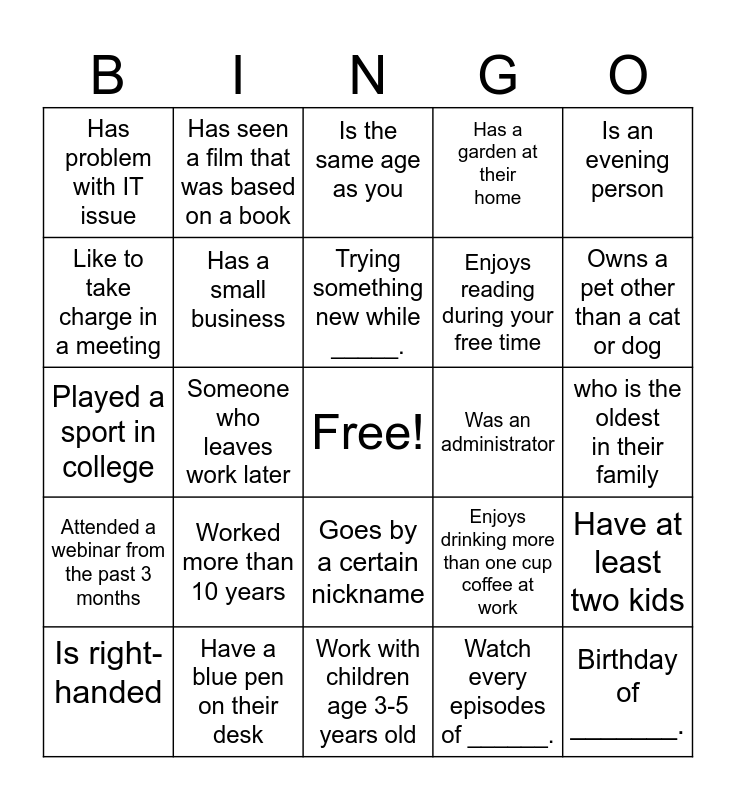 This bingo card has a free space and 24 words: Worked more than 10 years, Have a blue pen on their desk, Trying something new while _____., Is right-handed, Is an evening person, Has problem with IT issue, Like to take charge in a meeting, Has seen a film that was based on a book, Was an administrator, Goes by a certain nickname, Enjoys reading during your free time, Played a sport in college, Enjoys drinking more than one cup coffee at work, Have at least two kids, Has a small business, Watch every episodes of ______., who is the oldest in their family, Is the same age as you, Owns a pet other than a cat or dog, Someone who leaves work later, Birthday of _______., Attended a webinar from the past 3 months, Has a garden at their home and Work with children age 3-5 years old.