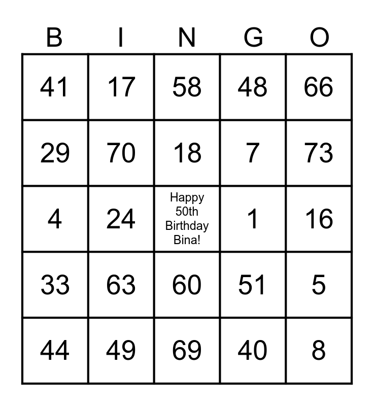 This bingo card has a free space and 24 words: 63, 49, 18, 44, 66, 41, 29, 17, 1, 60, 7, 4, 51, 5, 70, 40, 16, 58, 73, 24, 8, 33, 48 and 69.