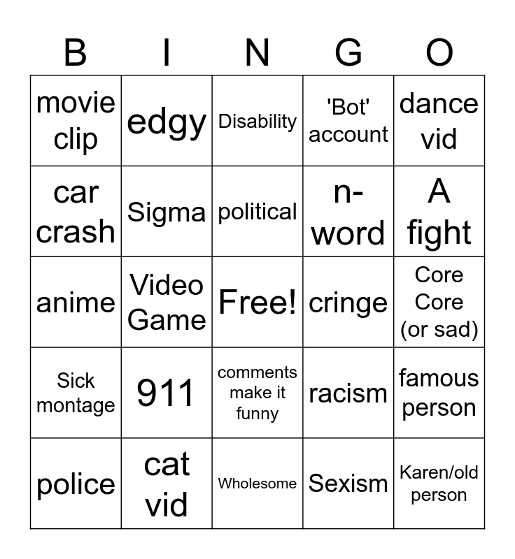 This bingo card has a free space and 24 words: 911, cat vid, political, police, dance vid, movie clip, car crash, edgy, cringe, comments make it funny, n-word, anime, racism, famous person, Sigma, Sexism, Core Core (or sad), Disability, A fight, Video Game, Karen/old person, Sick montage, 'Bot' account and Wholesome.