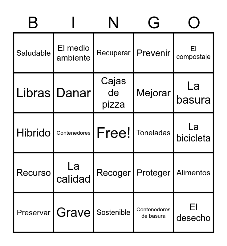 This bingo card has a free space and 24 words: La calidad, Grave, Cajas de pizza, Preservar, El compostaje, Saludable, Libras, El medio ambiente, Toneladas, Recoger, Mejorar, Hibrido, Proteger, Alimentos, Danar, Contenedores de basura, La bicicleta, Recuperar, La basura, Contenedores, El desecho, Recurso, Prevenir and Sostenible.
