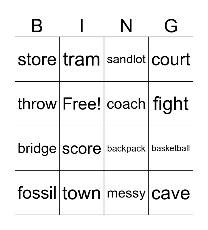 This bingo card has 16 words: town, basketball, sandlot, store, bridge, tram, backpack, messy, throw, Free!, fossil, court, score, fight, coach and cave.