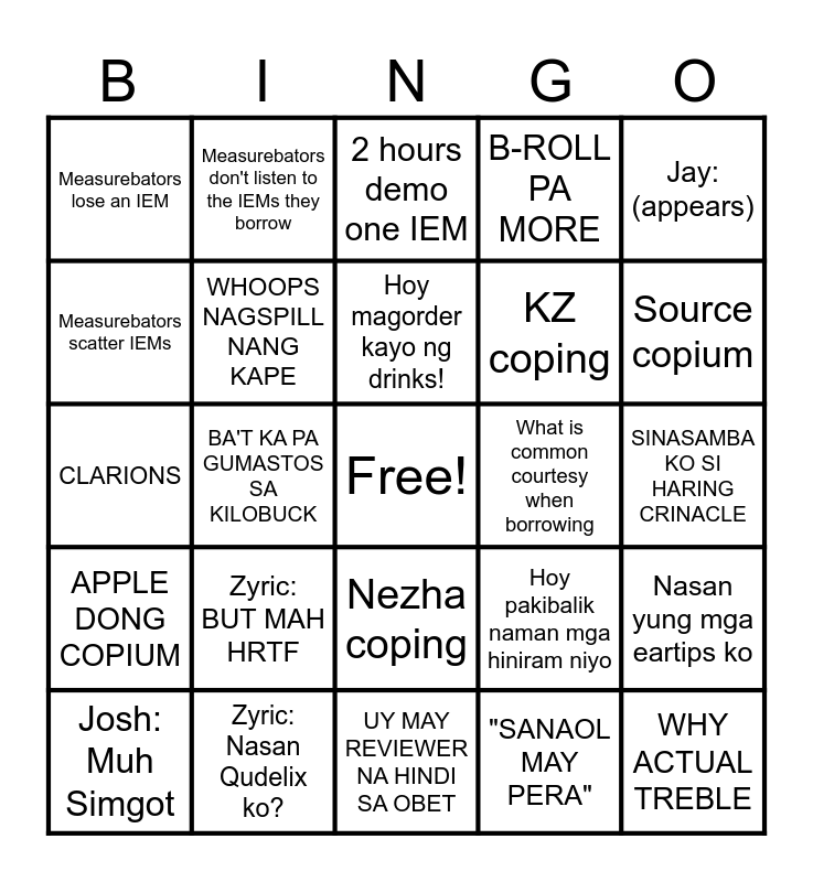This bingo card has a free space and 24 words: Zyric: BUT MAH HRTF, Zyric: Nasan Qudelix ko?, Hoy magorder kayo ng drinks!, Josh: Muh Simgot, Jay: (appears), Measurebators lose an IEM, Measurebators scatter IEMs, Measurebators don't listen to the IEMs they borrow, What is common courtesy when borrowing, Nezha coping, KZ coping, CLARIONS, Hoy pakibalik naman mga hiniram niyo, Nasan yung mga eartips ko, WHOOPS NAGSPILL NANG KAPE, "SANAOL MAY PERA", SINASAMBA KO SI HARING CRINACLE, 2 hours demo one IEM, Source copium, BA'T KA PA GUMASTOS SA KILOBUCK, WHY ACTUAL TREBLE, APPLE DONG COPIUM, B-ROLL PA MORE and UY MAY REVIEWER NA HINDI SA OBET.