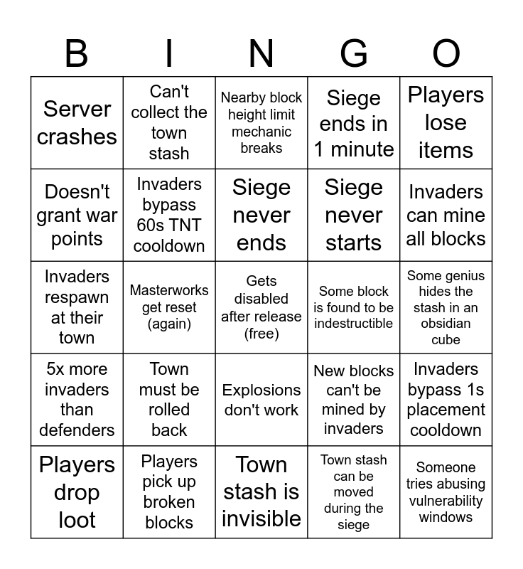 This bingo card has a free space and 24 words: Town must be rolled back, Players pick up broken blocks, Siege never ends, Players drop loot, Players lose items, Server crashes, Doesn't grant war points, Can't collect the town stash, Some block is found to be indestructible, Explosions don't work, Siege never starts, Invaders respawn at their town, New blocks can't be mined by invaders, Invaders bypass 1s placement cooldown, Invaders bypass 60s TNT cooldown, Town stash can be moved during the siege, Some genius hides the stash in an obsidian cube, Nearby block height limit mechanic breaks, Invaders can mine all blocks, Masterworks get reset (again), Someone tries abusing vulnerability windows, 5x more invaders than defenders, Siege ends in 1 minute and Town stash is invisible.