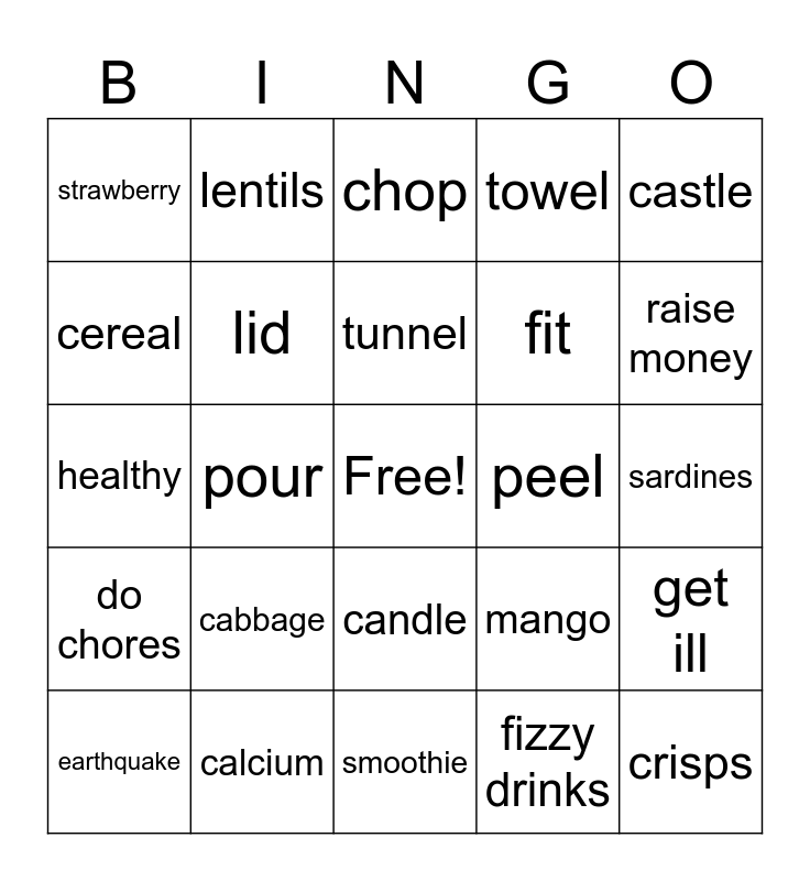 This bingo card has a free space and 31 words: smoothie, fridge, pour, blender, strawberry, chop, lid, mango, peel, fizzy drinks, sardines, crisps, beans, ride bike, raise money, charity, get ill, cabbage, do chores, candle, castle, victim, earthquake, lentils, fit, cereal, towel, healthy, calcium, tunnel and charity.