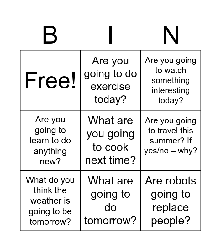 This bingo card has 9 words: What do you think the weather is going to be tomorrow?, Are you going to watch something interesting today?, Are you going to do exercise today?, Are you going to learn to do anything new?, Free!, Are you going to travel this summer? If yes/no – why?, What are you going to cook next time?, Are robots going to replace people? and What are going to do tomorrow?.