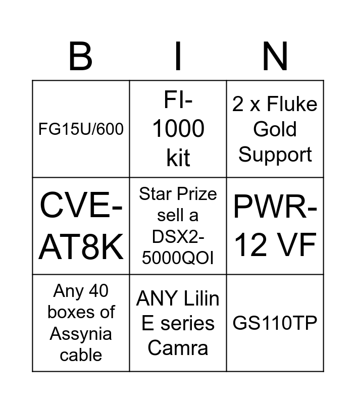 This bingo card has a free space and 8 words: PWR-12 VF, 2 x Fluke Gold Support, FI-1000 kit, Any 40 boxes of Assynia cable, FG15U/600, GS110TP, CVE-AT8K and ANY Lilin E series Camra.